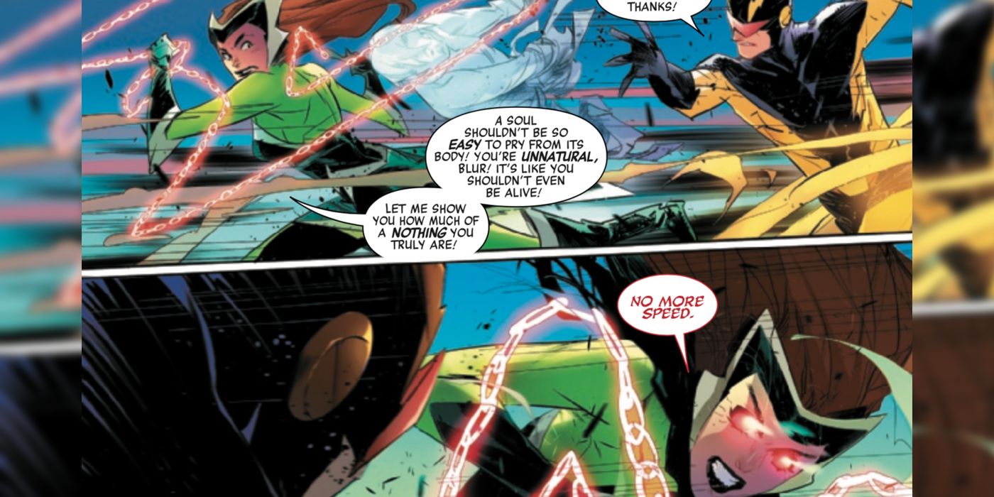 Blur goes from a hero who is so fast he becomes displaced from time to barely being able to move his feet. He tries his best to run away from the Silver Witch and nearly succumbs to her spell. However, he uses his focus to regain his speed and ultimately defeats the sorceress, escaping the Dread Dimension and getting his soul back.