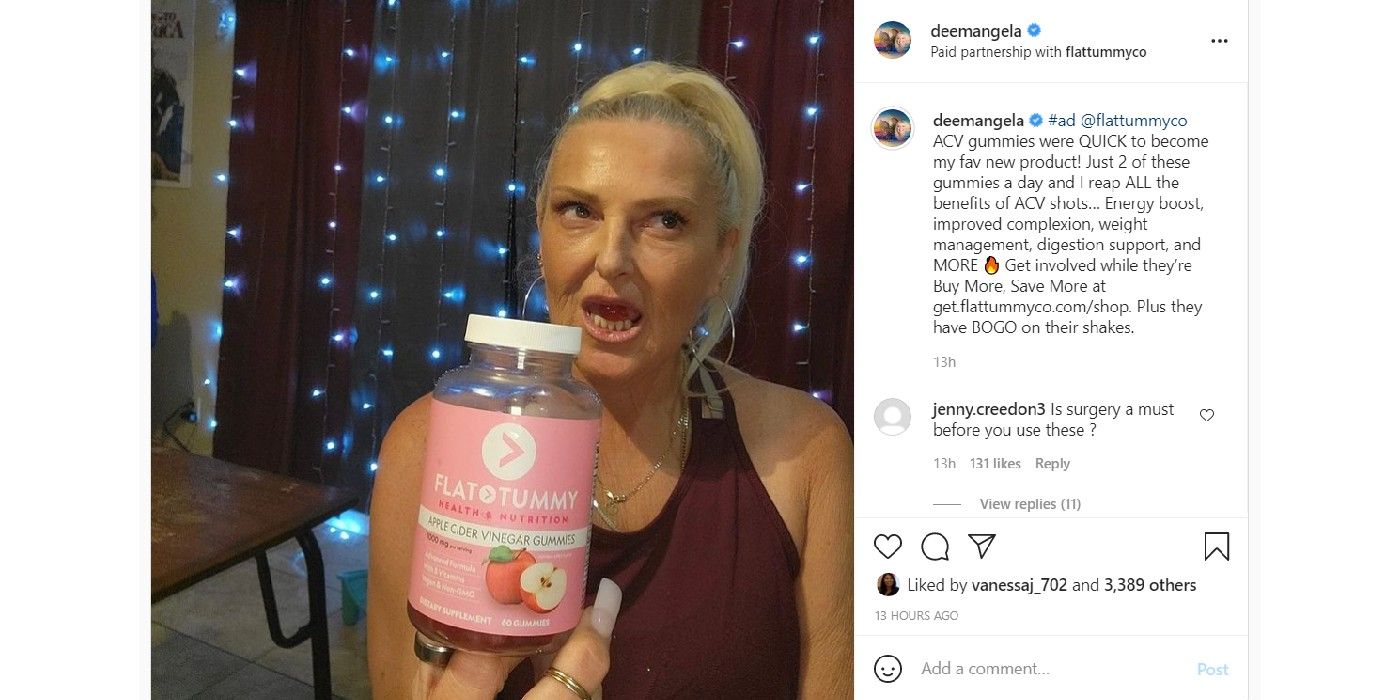While fans are watching Angela Deem’s operations bear fruit with her already losing 40 pounds, her Instagram promotions are hard to digest. The skinny meemaw went back to pushing her “flat tummy” agenda on fans in a recent post. According to Angela’s caption, the apple cider vinegar gummies give her an “energy boost, improved complexion, weight management, digestion support and MORE.” However, fans are pleading for Angela to stop peddling diet products on social media, since she herself had admitted, “I have tried fat burning pills, and none of it’s worked,” in the premiere episode of HEA season 6.