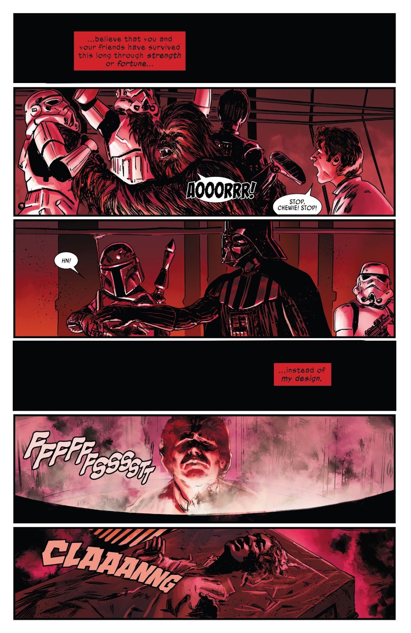 While Han Solo is in the process of being frozen in carbonite by Darth Vader on Cloud City, Boba Fett has an opportunity to blast the smuggler’s fury friend Chewbacca. However, Vader lifts up his arm to prevent the bounty hunter from taking the shot, as the Wookie growls in protest. This moment has been a source of speculation for years, as it would have made sense for Boba Fett to shoot Chewbacca along with the other rebels. However, there was a little more to it, as revealed in Star Wars: Darth Vader #12 written by Greg Pak with art by Guiu Vilanova.