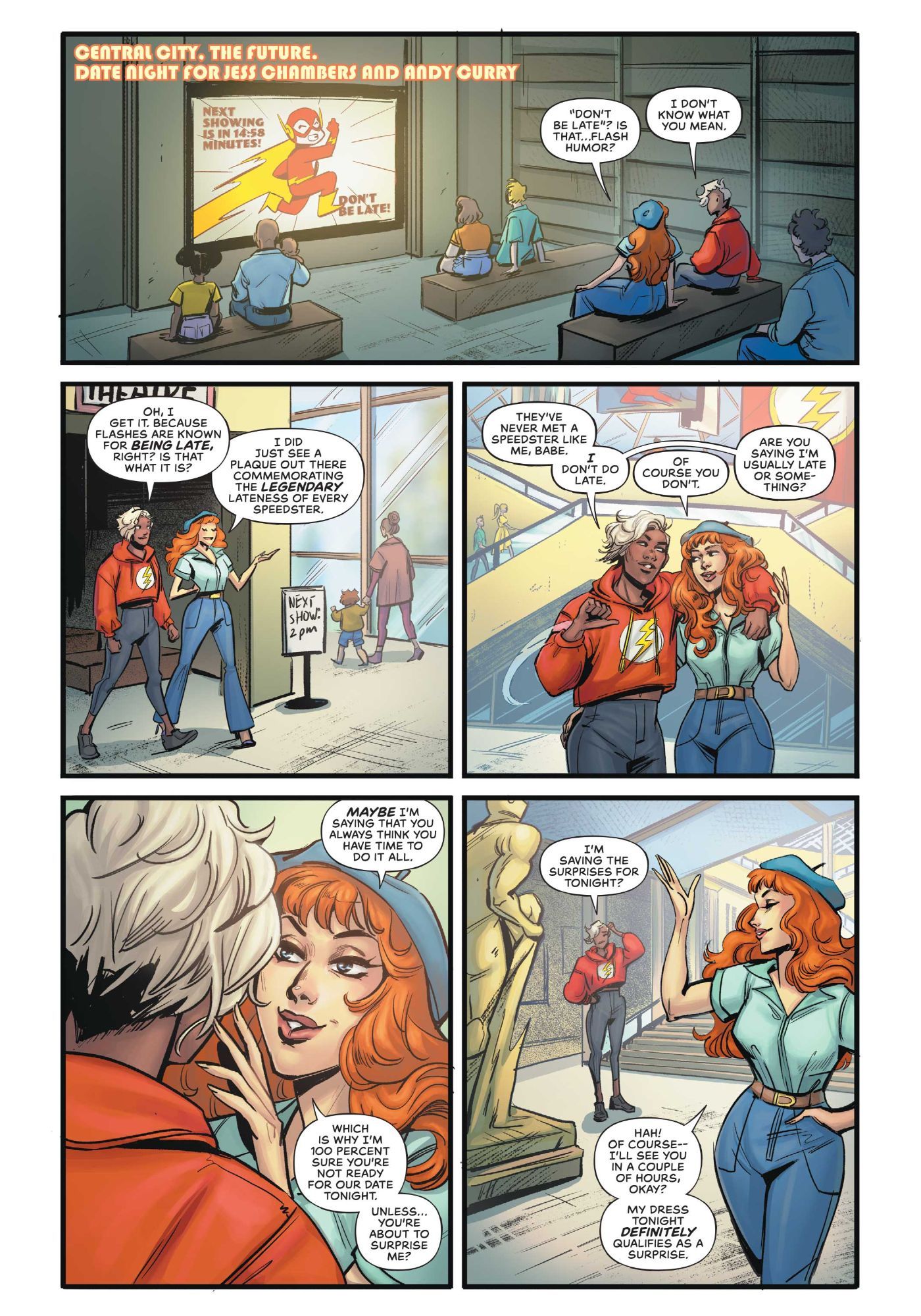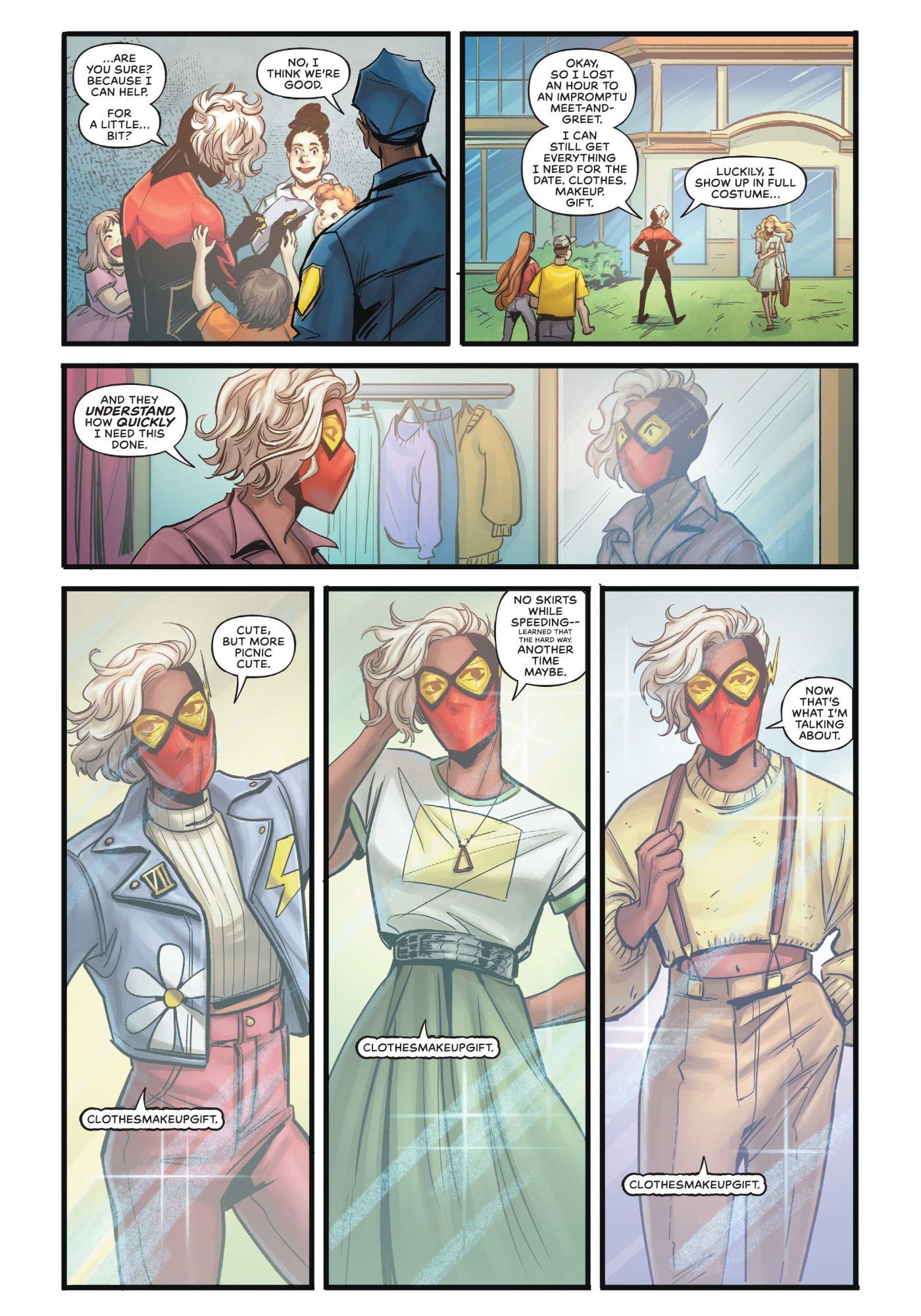 But yeah, from there, I had a couple of ideas for what I wanted to do with Jess - but this one really is based on my initial idea. Which is that, with a new legacy character, it's really fun to play with both what makes them stand out in the legacy and also what things they share. Because no matter who's in the suit, there are certain things that you want to vibe with when you pick up a Flash story. For me, I also have ADHD, so I related to Wally West a lot because a lot of his experience of trying to interact with people while being at warp speed - which is kind of my lived experience. That, for me, is an iconic part of the Flashes. But I wanted to play with how that looks different with Jess.