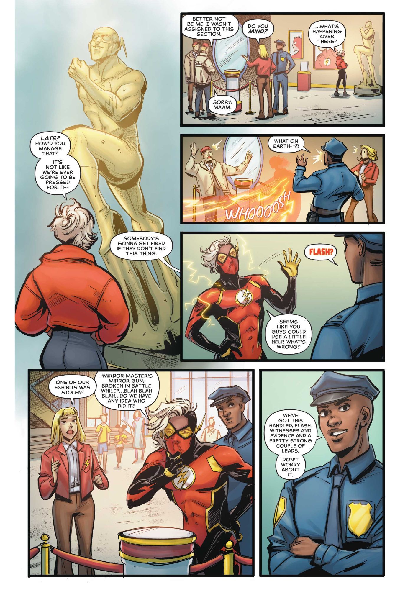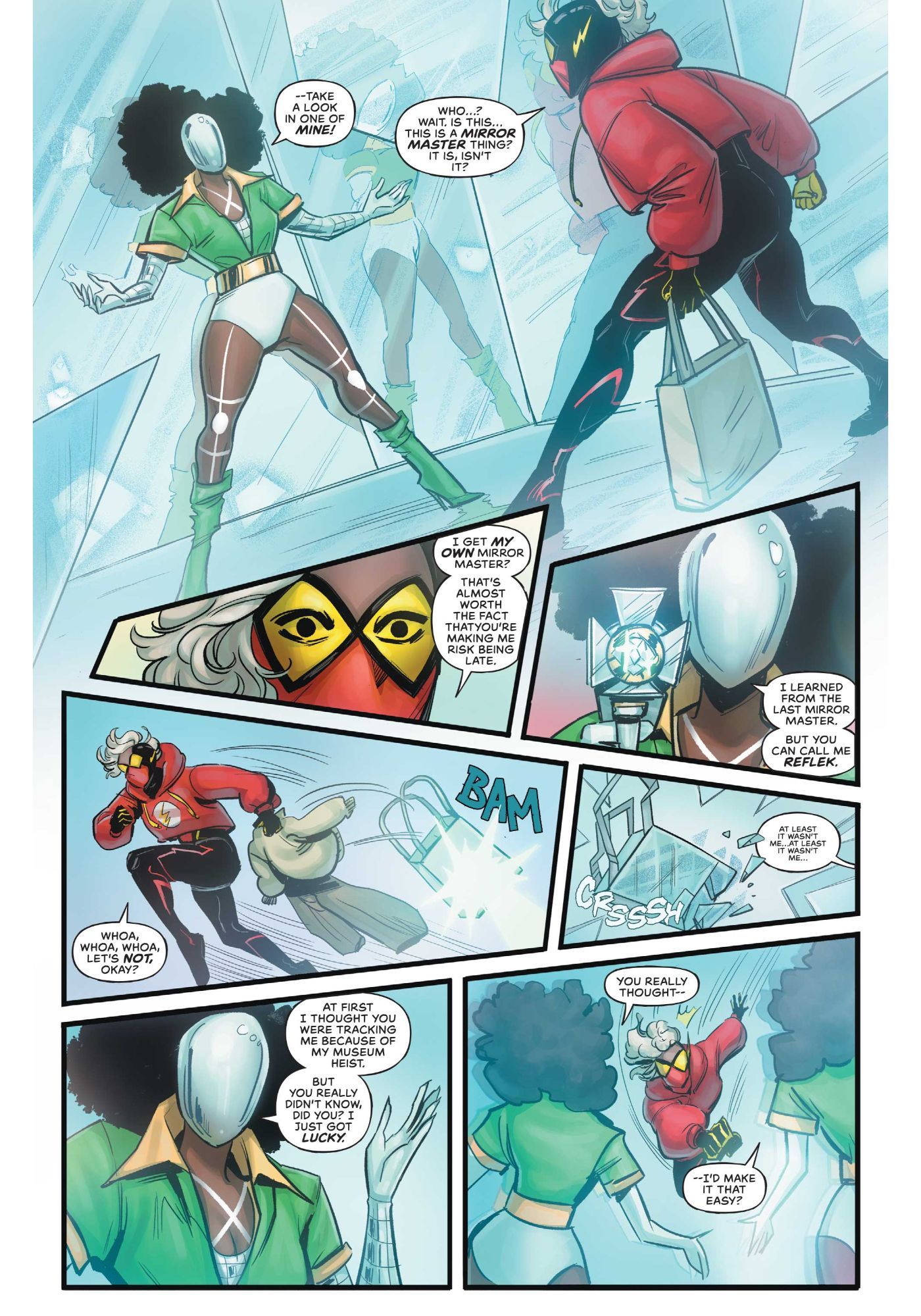And Reflek actually came out of a two-fold joke for me, because obviously, they're based on the classic villain is Mirror Master. And then from there, I was like, "wouldn't it be really fun to have a Flash villain with big puffy curly hair?" In part because there's a lot of fun you can do with wet dry hair with curls or with frizziness, and speed and heat. So, I wanted to leave that on the table for all of us who might get to write Reflek afterwards.