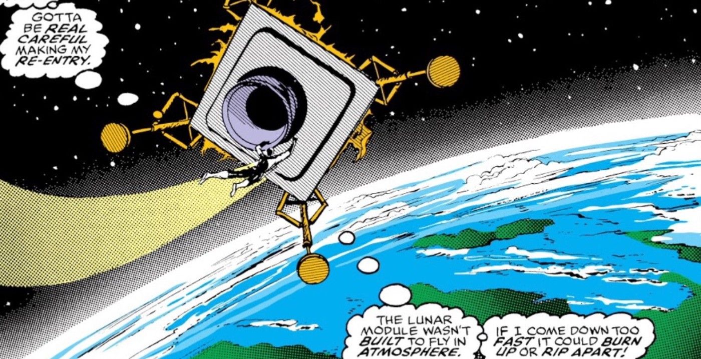 The first Star Brand, Ken Connell, made one of the most gloriously over-the-top public debuts in comic history. After operating for secrecy for several months, Star Brand decided to go public, and he made his presence known in a grand fashion: by stealing the Eagle, the lander from the Apollo 11 moon mission, and dropping it on the White House Lawn. It happens in The Star Brand #11, written and drawn by John Byrne.