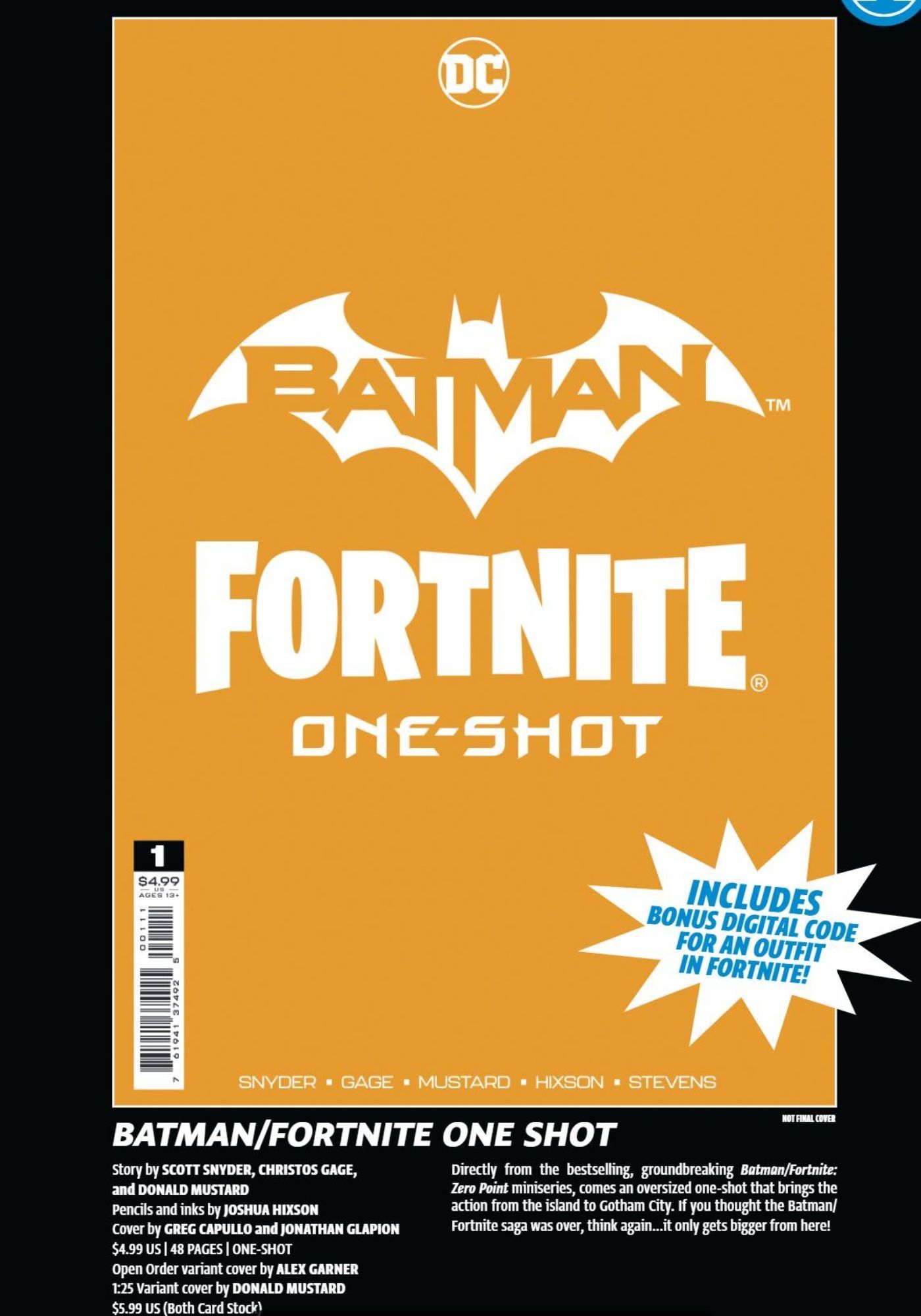 DC Comic's upcoming 48-page Batman/Fortnite One-Shot will be by Scott Snyder, Christos Gage, Donald Mustard, Joshua Hixon. While details remain scarce (including no officially revealed cover), the solicit does reveal the action from Fortnite Island will be coming to Gotham City, while the Batman/Fortnite saga is teased as getting even bigger than ever. The issue will feature a cover from legendary Batman artists Greg Capullo and Jonathan Glapion. The one-shot also features an open order variant from Alex Garner and a 1:25 variant from Mustard.