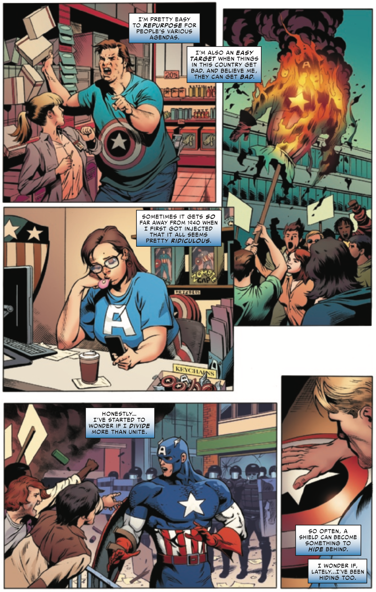 The Smithsonian's new exhibit, Americans Who Fight (Steve doesn't like the name, as it insinuates that people who resorted to violent solutions are more honorable than those who didn't fight so much as reached) is incomplete; the museum wants to put Captain America's shield on display. Their replica isn't enough - they tell Steve his actual shield would mean more to visitors. But Steve is unsure, thinking "I find myself too often stripped of what I'm supposed to stand for." He knows the Captain America name is often co-opted by those who use it for their own agendas...and he wonders if he's used said name to hide from American's many changes - and problems.
