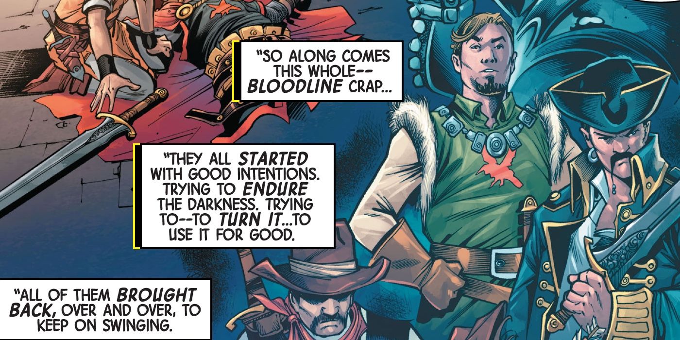 In this issue, it is revealed that this curse has afflicted many others through the ages as well. Previously, readers thought only Garrett and Percy had to bear this curse, but many others have too, and they represent a variety of eras, including a Renaissance-era adventurer, a pirate, a sheriff in the Old West, and a World War I era soldiermo. All of these Black Knights attempt to do the right thing, and not give into the darkness. Yet, every single one of them ultimately succumbs, and the last member of the Bloodline readers see is an enchanted Nazi soldier bearing the sword—was this intended to be an illustration of how far the curse can take a person? Just as it appears that the curse will take Dane, he walks away, refusing to be defined by his flaws. While this was the right course of action to take, it enrages Mordred, who seemingly kills the Black Knight.
