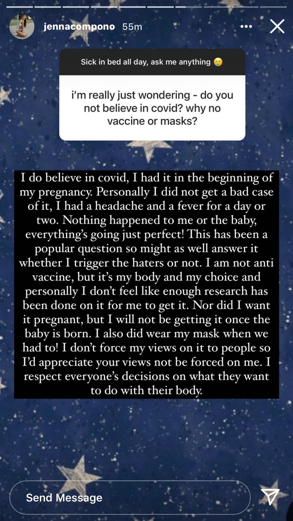 Jenna took to Instagram for a popular Q&A segment where she was questioned about not getting a vaccine or wearing a mask during the pandemic. While some governments are still begging citizens to wear face coverings and get vaccinated, Jenna opted to believe that she knew better than the medical professionals. In her Instagram story, she shared that when she contracted the virus, it wasn't that "bad." The reality TV star claimed that it was her body and she could choose what to put in it.