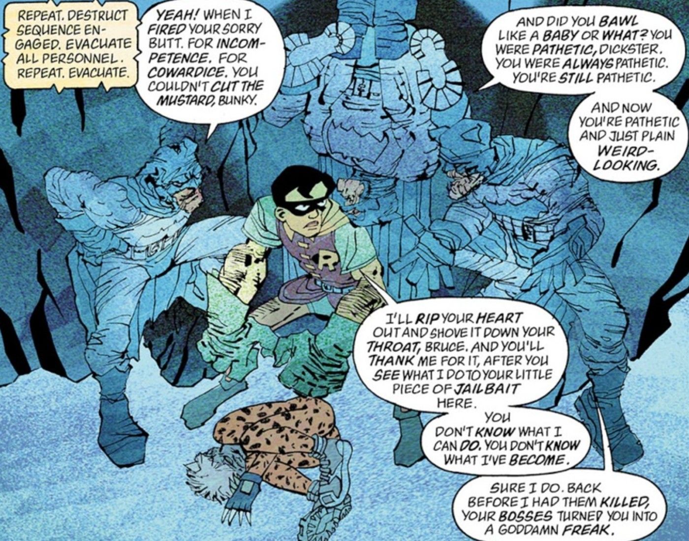 In The Dark Knight Strikes Again #3, Bruce arrives at the Batcave just in time to save Carrie's life from the sadistic Joker and reveals that he knows his real identity, Richard Grayson. With the truth exposed, the Joker changes his appearance to resemble his original Robin costume as his threats are undermined by Batman's taunts. The beaten and ragged Bruce Wayne appears to bully him, reminding him that he was fired for being weak and incompetent in the field and that his powers have changed nothing. Thanks to the now-deceased Lex Luthor, Grayson underwent an experimental procedure involving gene therapy that makes him nearly immortal as a result of cellular regeneration, but he was driven insane in the process. Their reunion is anything but pleasant as Bruce and Richard prepare to fight each other to the death in what remains of the Batcave.