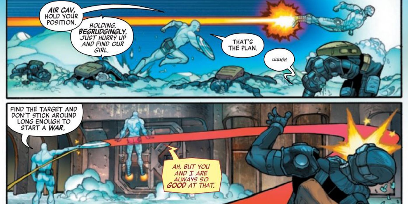 In Avengers #47 by Jason Aaron, Javier Garron, David Curiel, and Cory Petit, Iron Man and Captain America lead a rescue mission to save She-Hulk from the Winter Guard. The Russian superteam subdued the hero after infiltrating Avengers' Mountain in hopes of making her pay for decimating part of Moscow. In their stealth armor, Captain America and Iron Man take down the Winter Guard's outside forces. After making their way to the entrance, Steve tells Tony they can't stick around long enough to start a war. Iron Man's response? "Ah, but you and I are always so good at that."