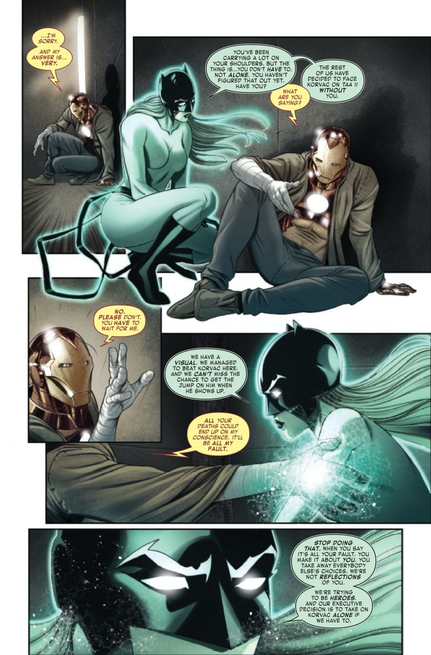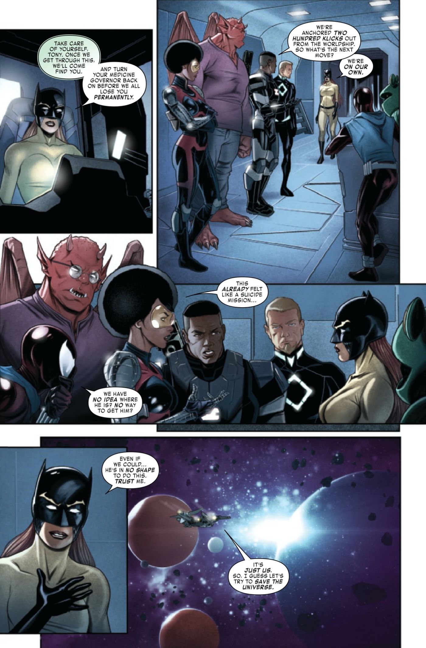 The preview opens with Hellcat, via holographic projection, telling Iron Man that Korvac is still out there, and he must return to help them. Iron Man tells Hellcat to wait on him, but she informs him that the team he put together have decided to take on Korvac without Iron Man. Back on their spaceship, Hellcat tells the team that they are on their own; the Scarlet Spider suggests going to find Tony, but Hellcat responds saying that due to deactivating the device regulating his morphine intake (a new feature of his suit following injuries sustained against Korvac), he is no shape to lead the team, leaving them to save the universe.