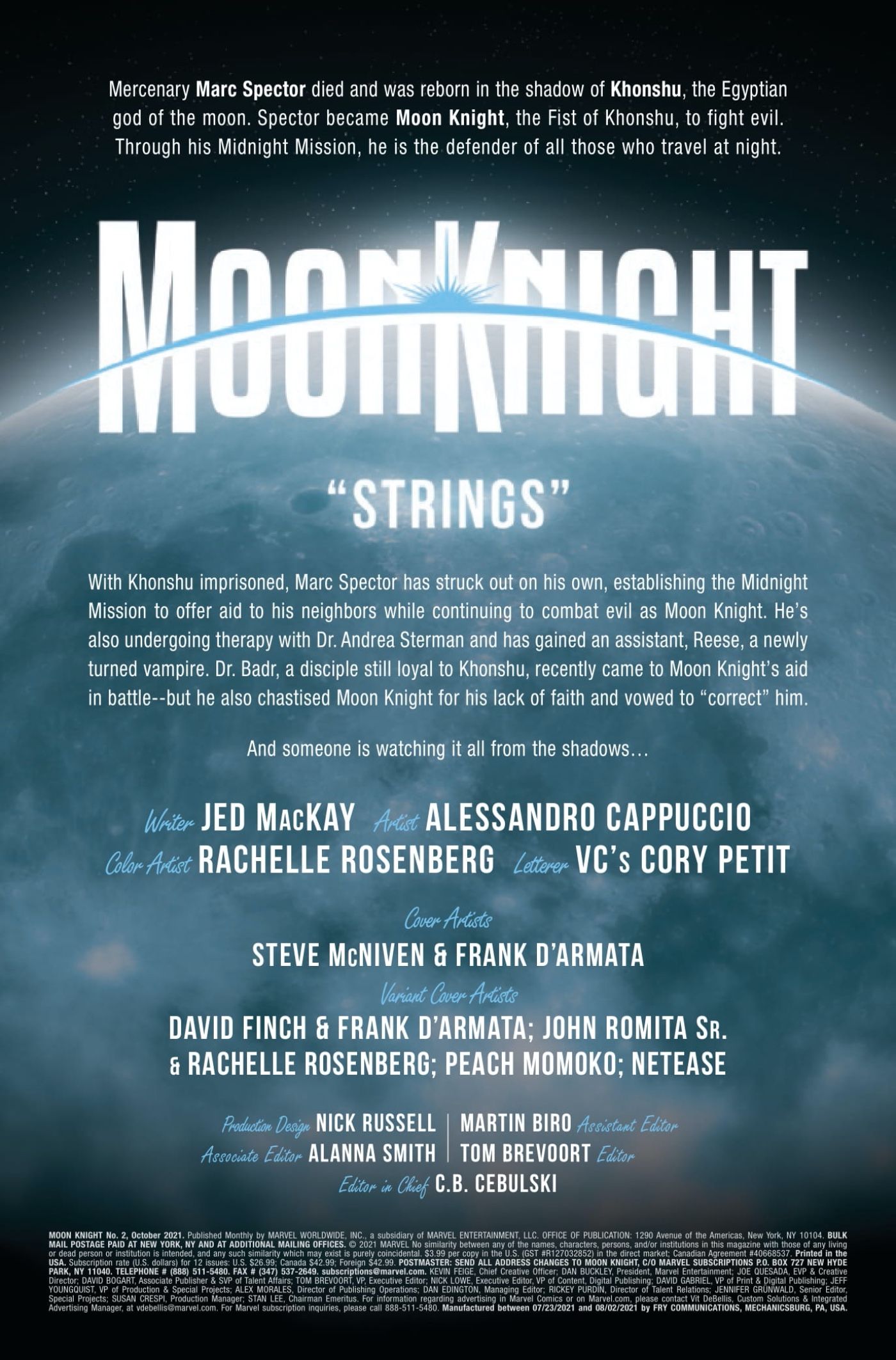 In the past, Moon Knight worked under the patronage of the moon god Khonshu, who protects all those who travel by night. Recently, however, Moon Knight parted ways with Khonshu, and struck out on his own, forming the Midnight Mission and offering solace and protection to those traveling at night. In the previous issue, Moon Knight dispatched a nest of vampires, and recruited a new assistant from their ranks named Reese. Now, a mysterious force has taken possession of random groups of elderly people, and it is up to Moon Knight to stop it. The issue is written by Jed MacKay with art by Alessandro Cappuccio, colors by Rachelle Rosenberg and letters by Cory Petit.