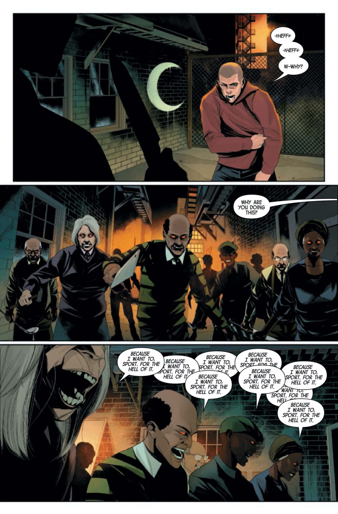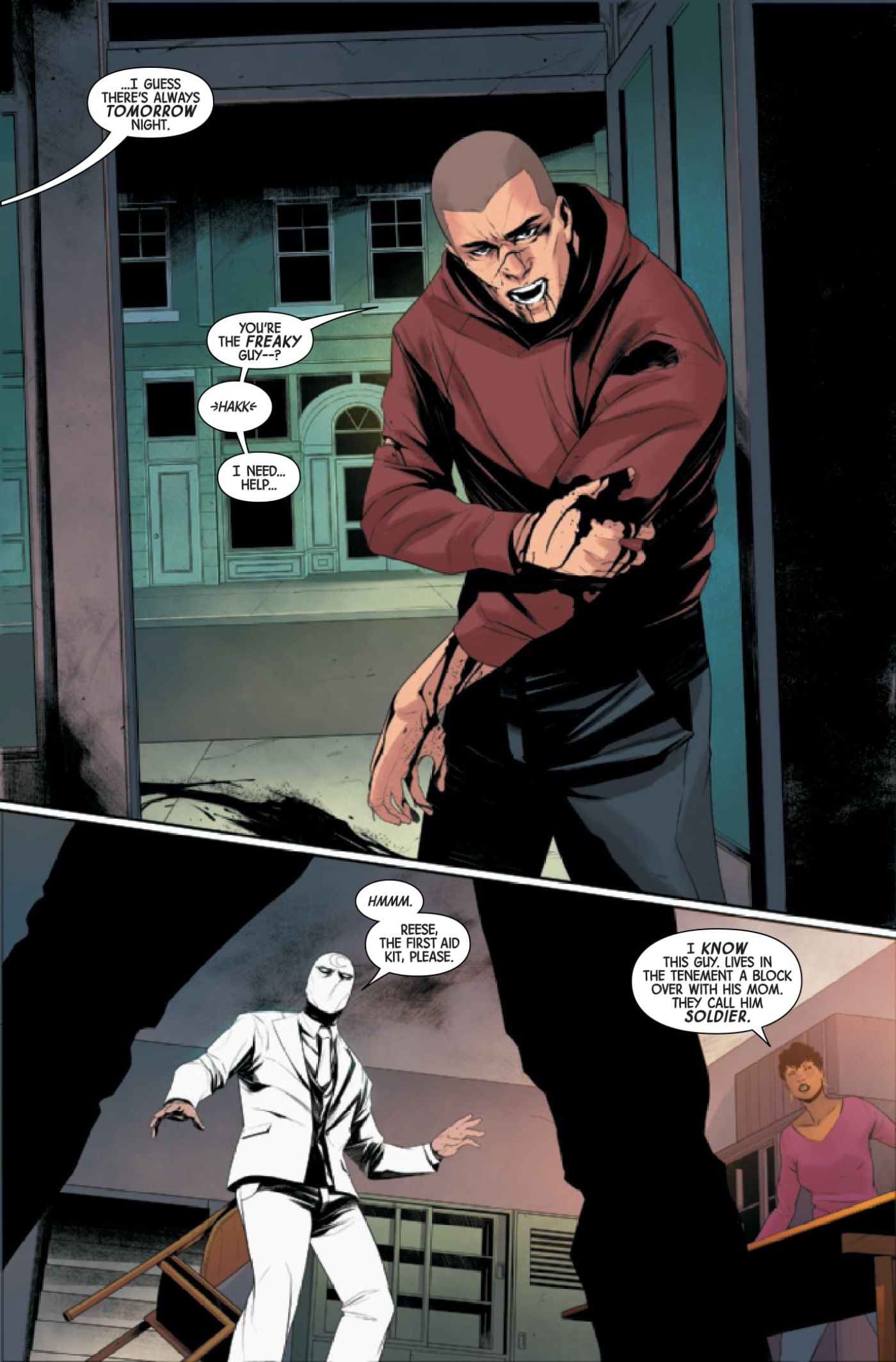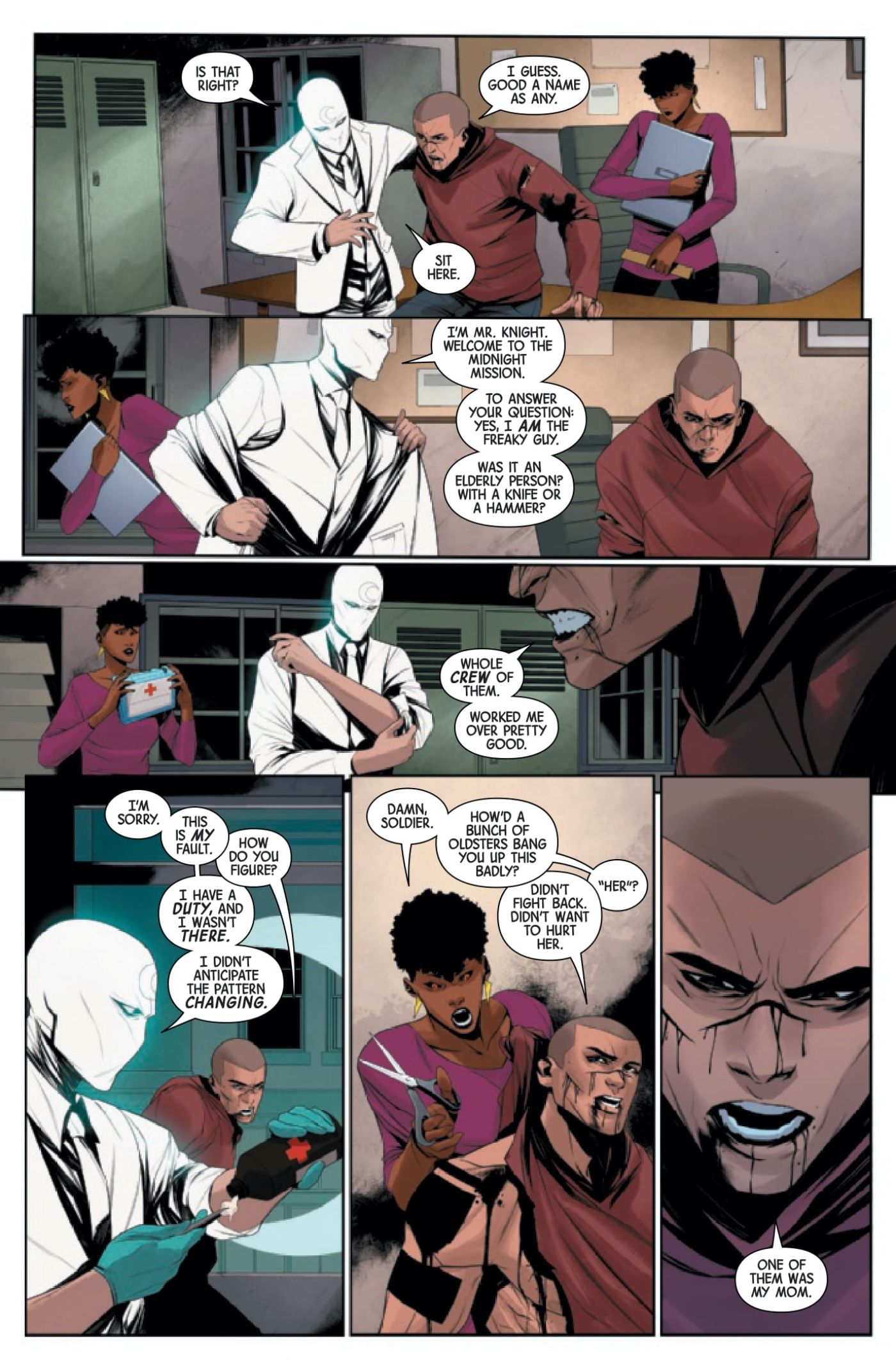 The preview opens with a young man being stalked by a frenzied mob of the elderly, some of them brandishing weapons. Their eyes are glowing red, and it is clear something has taken control of them. Meanwhile, back at the Midnight Mission, Moon Knight has become aware of the problem as well, and he and Reese discuss solutions. The young man then arrives at the Mission, seeking Moon Knight’s aid. As Moon Knight and Reese tend to his wounds, Soldier explains the eldery mob worked him over but that he did not fight back because his mother was one of the possessed.