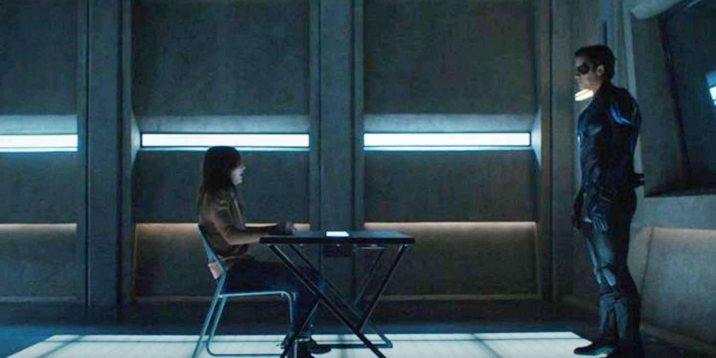 Many Batman fans would've noticed the clear parallels between this Titans season 3 scene and The Dark Knight's interrogation between Christian Bale's Batman and Heath Ledger's Joker. Similar to Anne Williams, the Joker is taken into GCPD custody as part of his grand plan. Joker was clamoring for an audience with Bruce long before his capture, meaning both he and Anne seek a superhero parlay instead of a traditional police interrogation. The real similarity between the two scenes, however, is the Caped Crusader silently appearing in the interrogation cell behind Joker, taking him by surprise as he slams the villain's head into the desk. Titans riffs heavily on this for Nightwing's entrance (though Dick obviously stops short of slamming an innocent woman into a table). Both scenes also move from dark to light as their respective heroes emerge from the shadows. The two rooms are shrouded in black until Batman/Nightwing make their presence known, after which the lights turn on brightly.