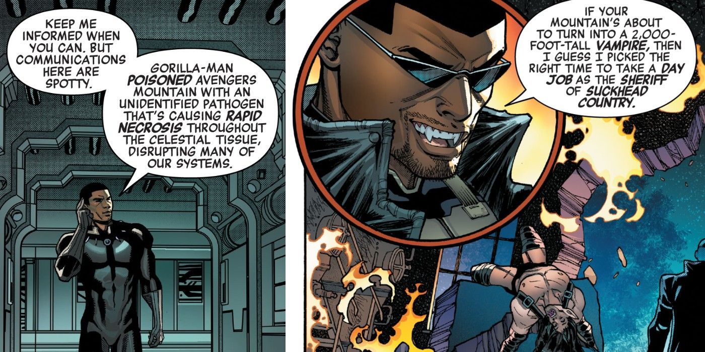 While the Avengers are busy fighting a brainwashed She-Hulk, Blade is in Russia, at the Vampire Nation. He is in radio contact with Black Panther, who is back at Avengers Mountain. Panther tells Blade that the Mountain, built around the body of a Celestial, has been infected with a virus causing rapid necrosis. Blade tells Black Panther it sounds like Dracula has weaponized his blood, making it so potent that it might turn the Celestial into a vampire. Black Panther tells Blade he will worry about the mountain, and Blade returns to killing vampires.