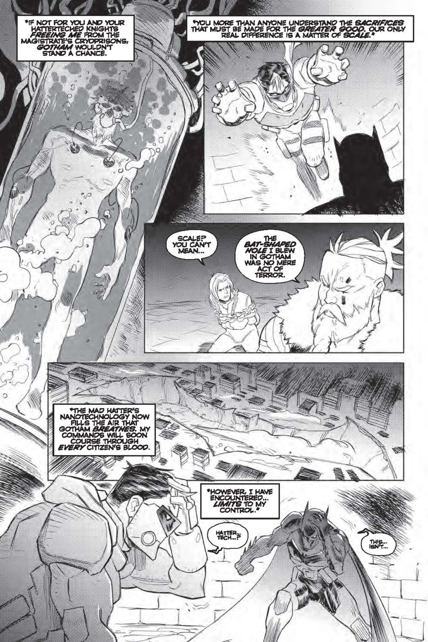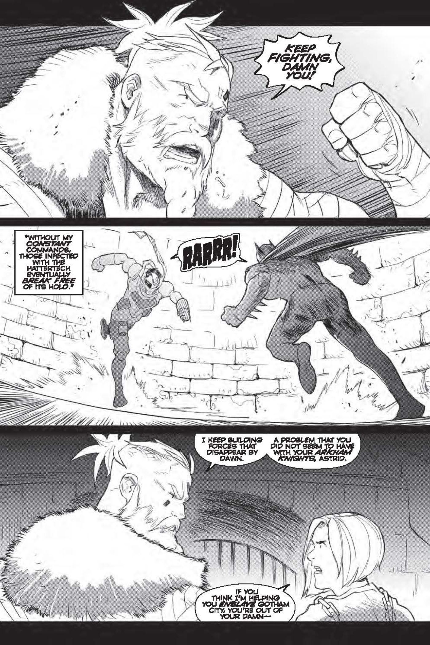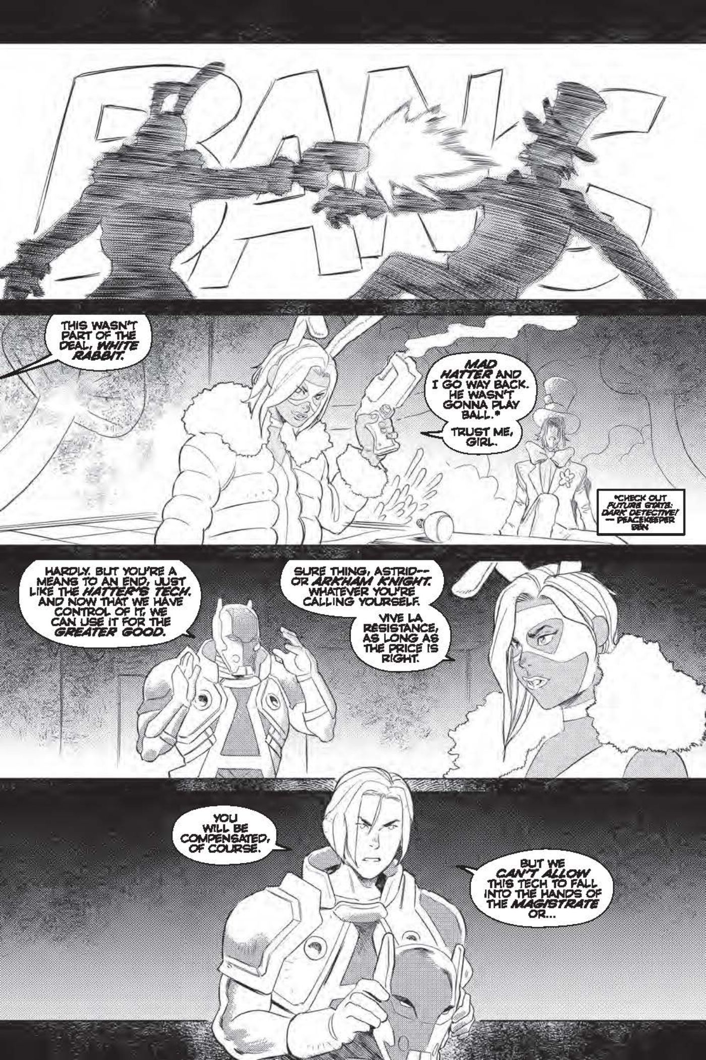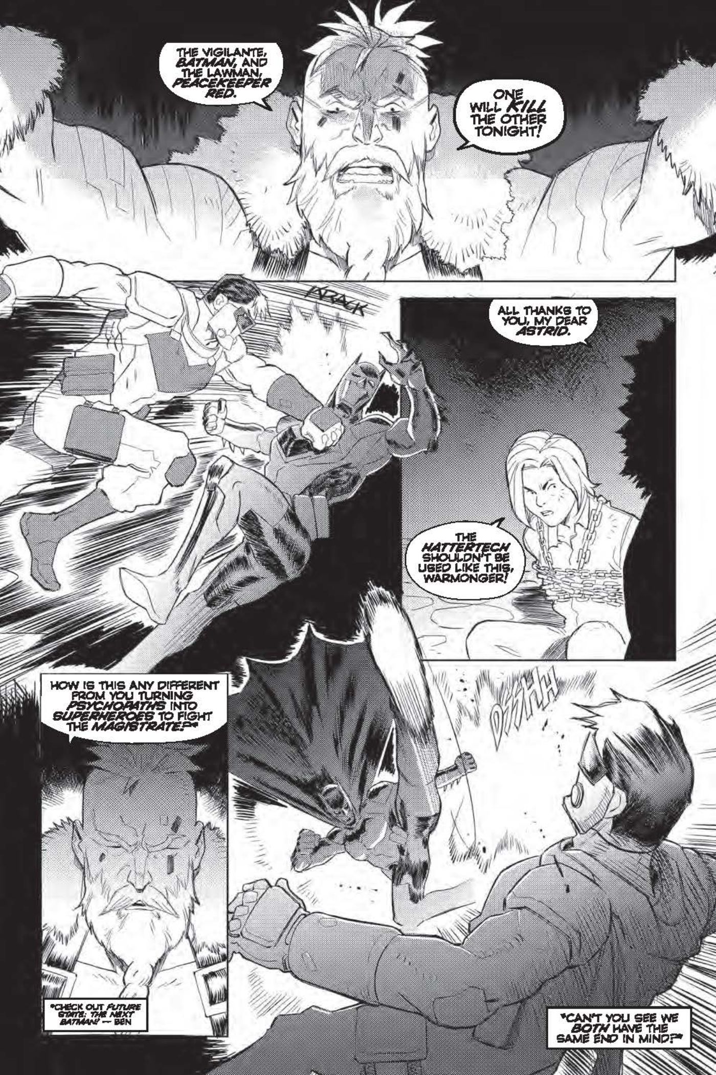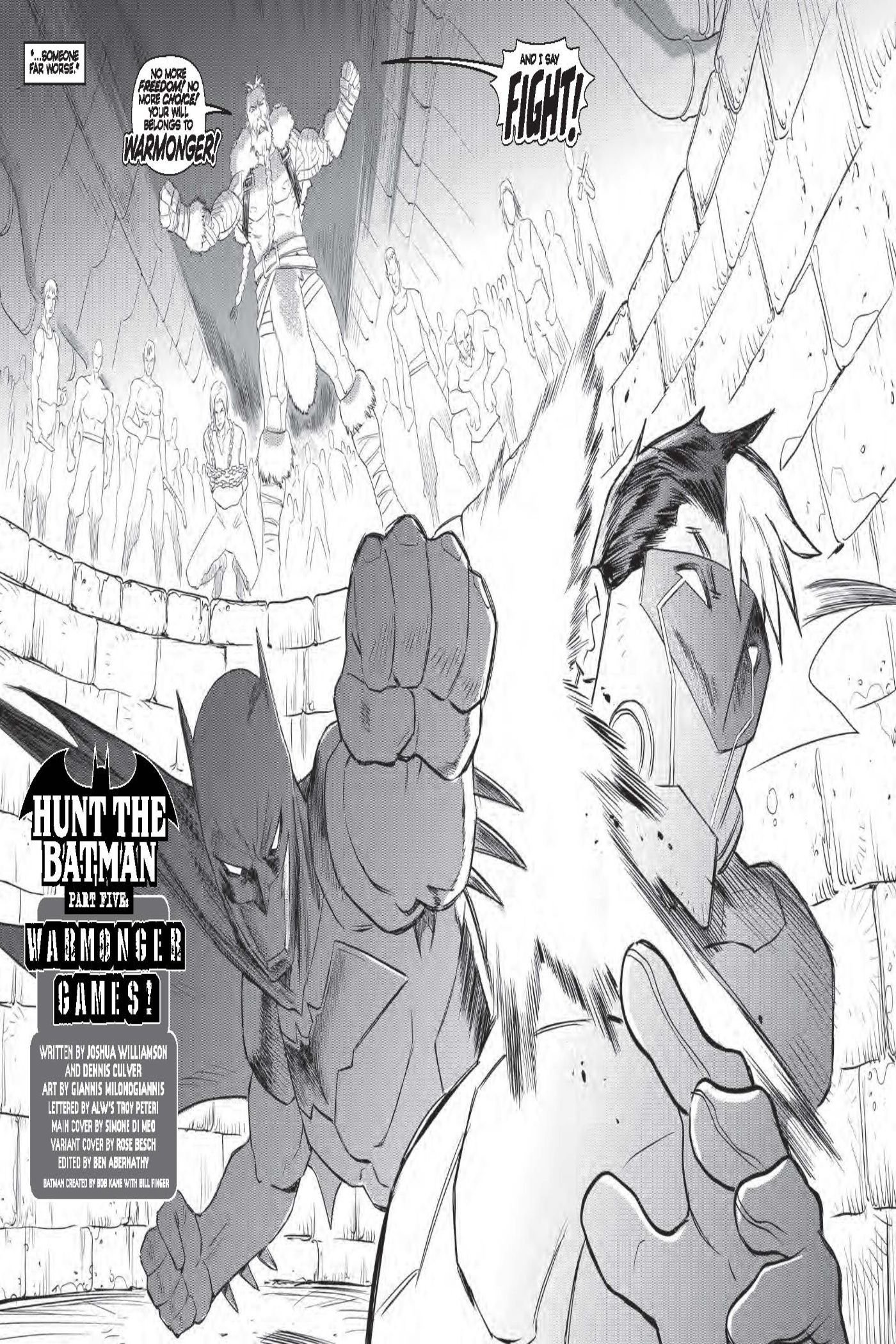 In an exclusive preview of Future State: Gotham #5 by Joshua Williamson, Dennis Culver, Giannis Milonogiannis, ALW's Troy Peteri, Batman, and Red Hood exchange blows in the Forge of Warriors, as Warmonger watches over, telling his audience (including Astrid Arkham) that one of them will die. Warmonger reveals he was saved by Astrid from the Magistrate putting him in a cyoprison, and intends to use the hattertech to control the city.