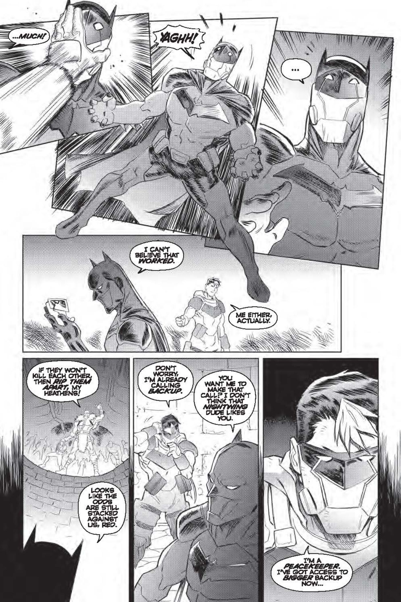 As the tech-controlled Batman gets ready to attack the Red Hood, Jason realizes he can block the hattertech by using his mask, as he puts it on his opponent's face. Both Peacekeeper Red and the next Batman are surprised the mask blocks the transmission and frees them of Warmonger's control. However, the villain doesn't stand by and let them figure out how to get out of the situation - sending his own army at them. Peacekeeper Red responds by calling in backup to fight back.