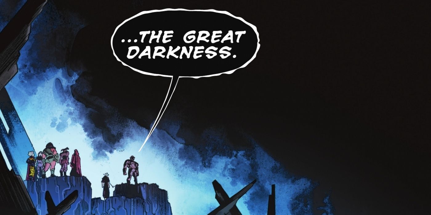 After his humiliating defeat, Darkseid gathers at the edge of the Multiverse, his family and new acolyte Extract attending him; he is also addressing some of the worst cosmic beings from across creation, including the Upside-Down Man and the Empty Hands. He tells them that Earth Omega was a trap left over from the Crisis on Infinite Earths and they will find the Flash and crack the Omniverse. He then tells those assembled that he alone will control…the Great Darkness. Readers then see a black void beyond the Lord of Apokolips.
