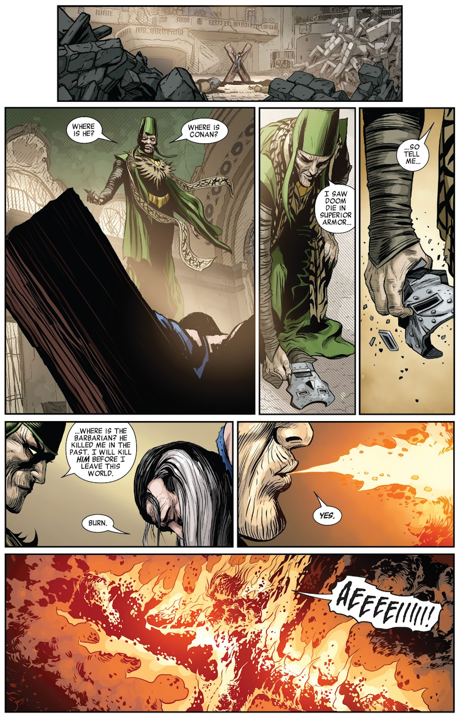 Some time later, Kulan Gath has devastated the Earth. Civilization has all but collapsed, heroes have either been killed or imprisoned (including Bruce Banner, chained by the adamantium bones of Wolverine) and Kulan Gath rules a world in ruins. Doctor Strange himself is kept a prisoner for years - mounted on a cross with his hand encased in wood. For all his magic, the Sorcerer Supreme is effectively powerless to defend himself - and when Kulan Gath receives no answer as to the whereabouts of Conan, he burns Doctor Strange alive.