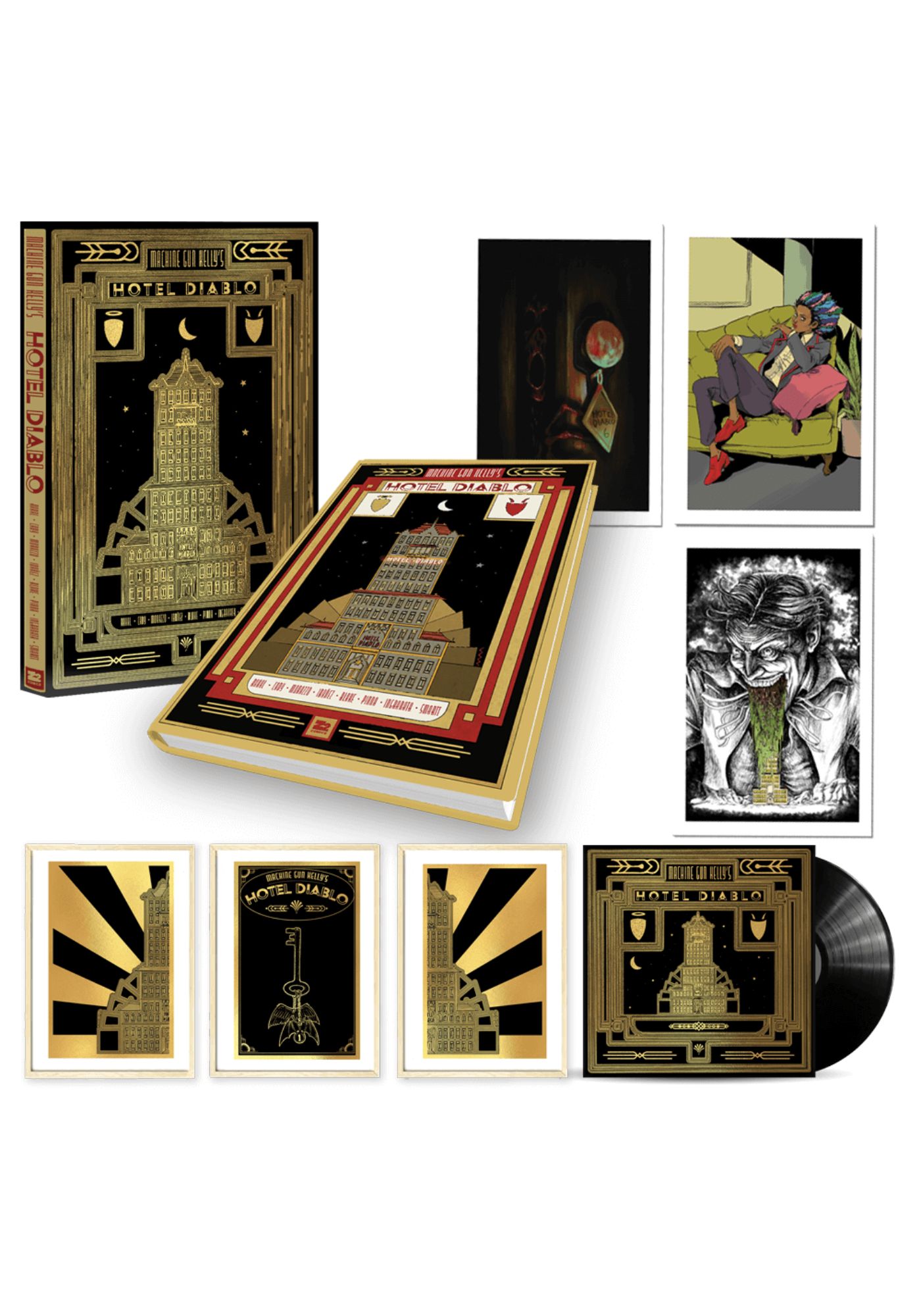 Z2 Comics has made three different versions of Hotel Diablo available for preorder. The standard edition comes with a softcover or hardcover graphic novel. The deluxe edition includes an oversized hardcover graphic novel with a slipcase, a re-issue of the 2019 album by Machine Gun Kelly featuring art by Morazzo and Tyler Boss, and three art prints by Jenna Cha, Trevor Henderson and Leslie Hung. The super-deluxe version of the graphic novel (which is sold out at the moment) comes with all of the above but is signed by MGK and features triptych art from Morazzo and Boss.