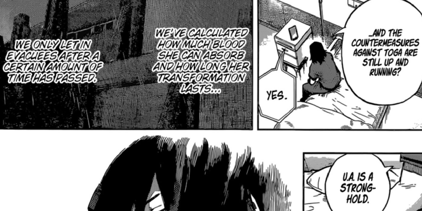 In chapter 325, Shota Aizawa asks to confirm whether their counter measures against Toga are still in effect. The school apparently spent a considerable amount of time observing Toga during their engagements with the villain, as they somehow acquired enough data to calculate how much blood she can absorb and how long her transformations can last in accordance with the amount of blood she has consumed. Based on these calculations, the school only allows evacuees onto campus grounds once they have been in observation for longer than Toga can hold a transformation to ensure none of them are Toga in disguise.